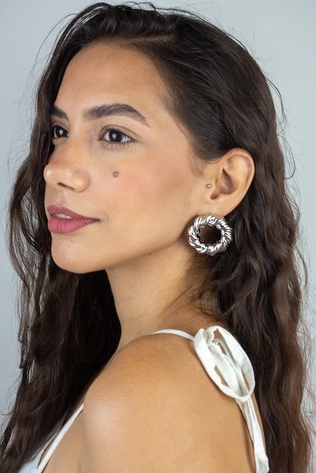 Este sofisticado brinco apresenta um design redondo grande com torções elegantes e detalhes vazados, criando um efeito leve e moderno. A textura delicada adiciona profundidade e charme à peça, enquanto o banho de ródio proporciona proteção contra oxidação e um brilho duradouro. Ideal para compor looks ousados e estilosos, este brinco é perfeito para quem busca um acessório de destaque que une contemporaneidade e elegância em um só design.